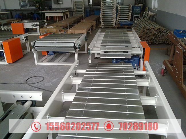 板鏈輸送機適用于形狀不規(guī)則物品的重載輸送。鏈條選用空心大輥子帶附件鏈條,在兩側同步鏈條的附件上用板狀構件連接使輸送方向形成連續(xù)的平板,因而運行平穩(wěn)。該機與鏈式或輥筒輸送機配合使用可實現(xiàn)轉角輸送。